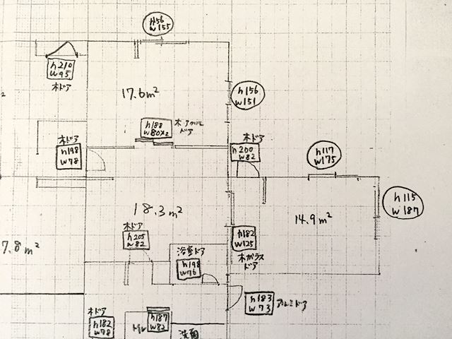 僕の家は設計士が書いた図面はなかったので、メジャーで一つ一つ部屋を測って面積を出し、ドアと窓の大きさも測って書いていきました。(1/100のスケールで書きました)