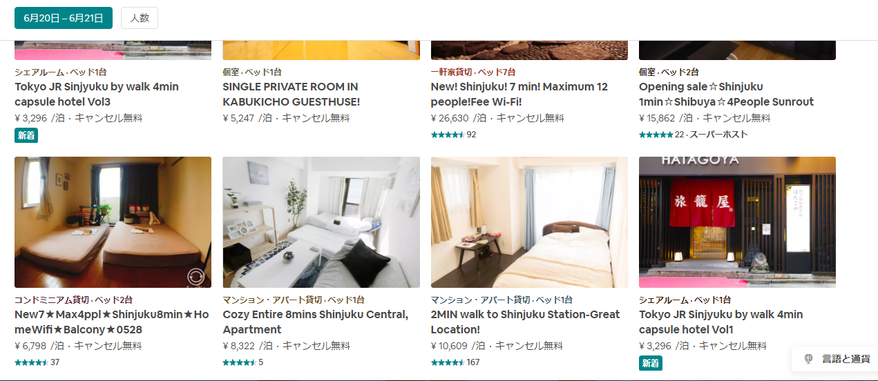 気になったので、Airbnbのサイトから新宿区で2018/06/15以降の宿泊日を設定してリスティングを見てみると結構な数のリスティングが表示されました。